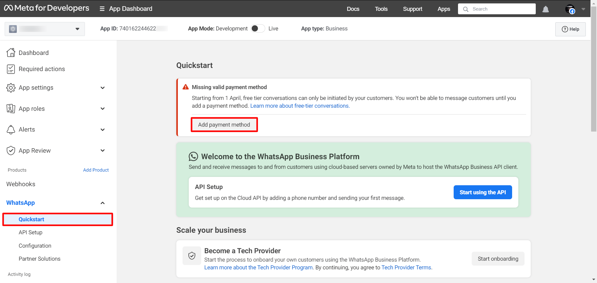 Since you will create an app for a WhatsApp business account, you have to add WhatsApp to the app.