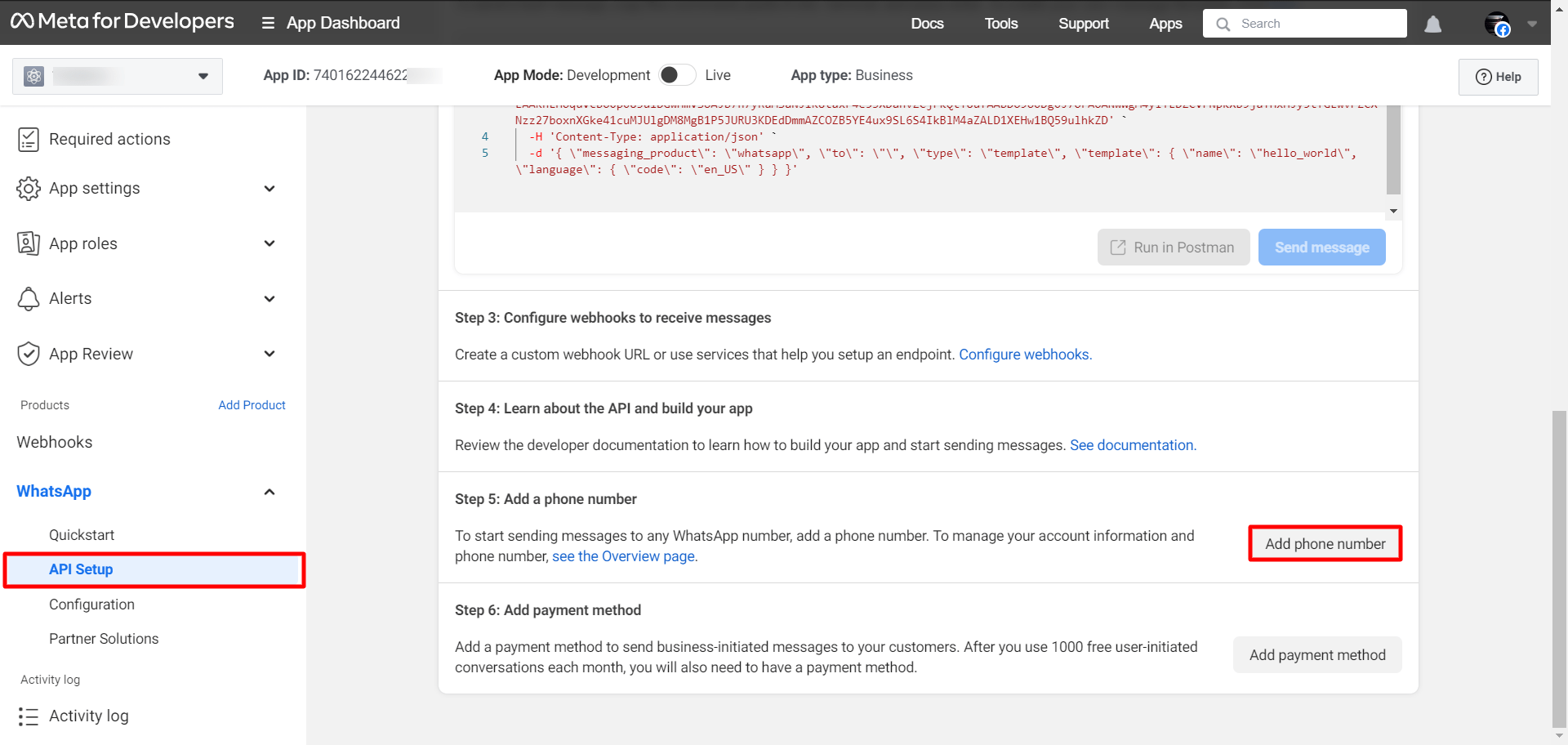 Now, you have to configure the webhook to receive messages. To configure webhooks, go to step 3 from the API setup and click on the Configure webhooks link.
