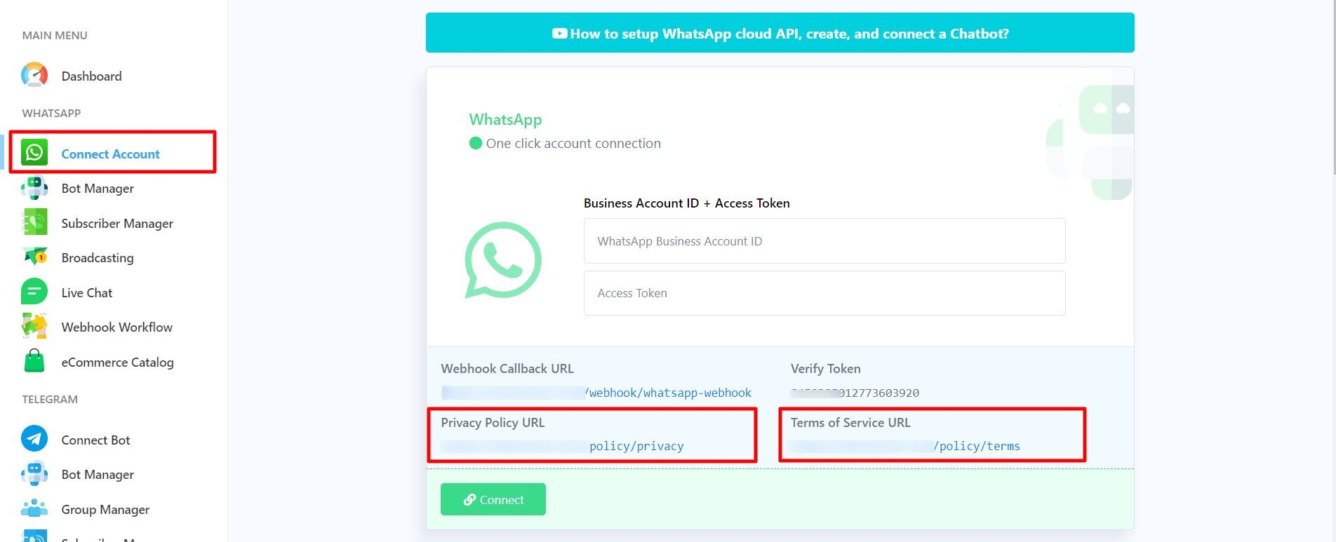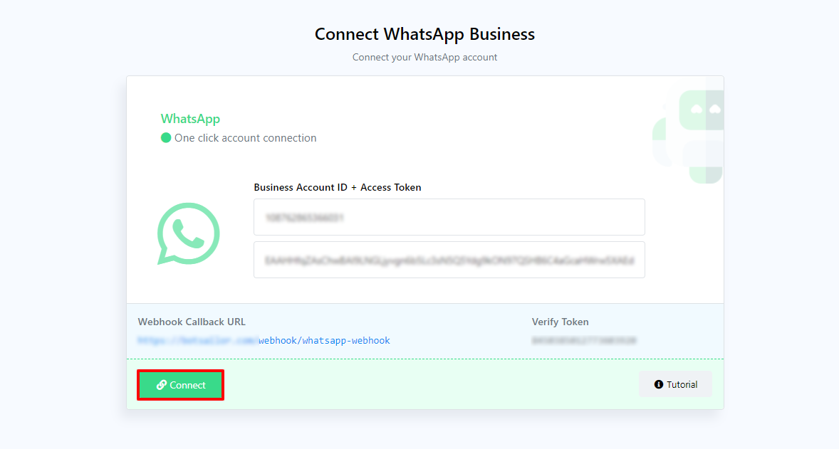 After entering the WhatsApp business account id and access token, click on the Connect button.