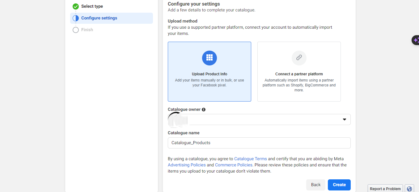 - Choose the upload method (Upload Product Info or Connect a partner platform). For now, select the Upload Product Info.